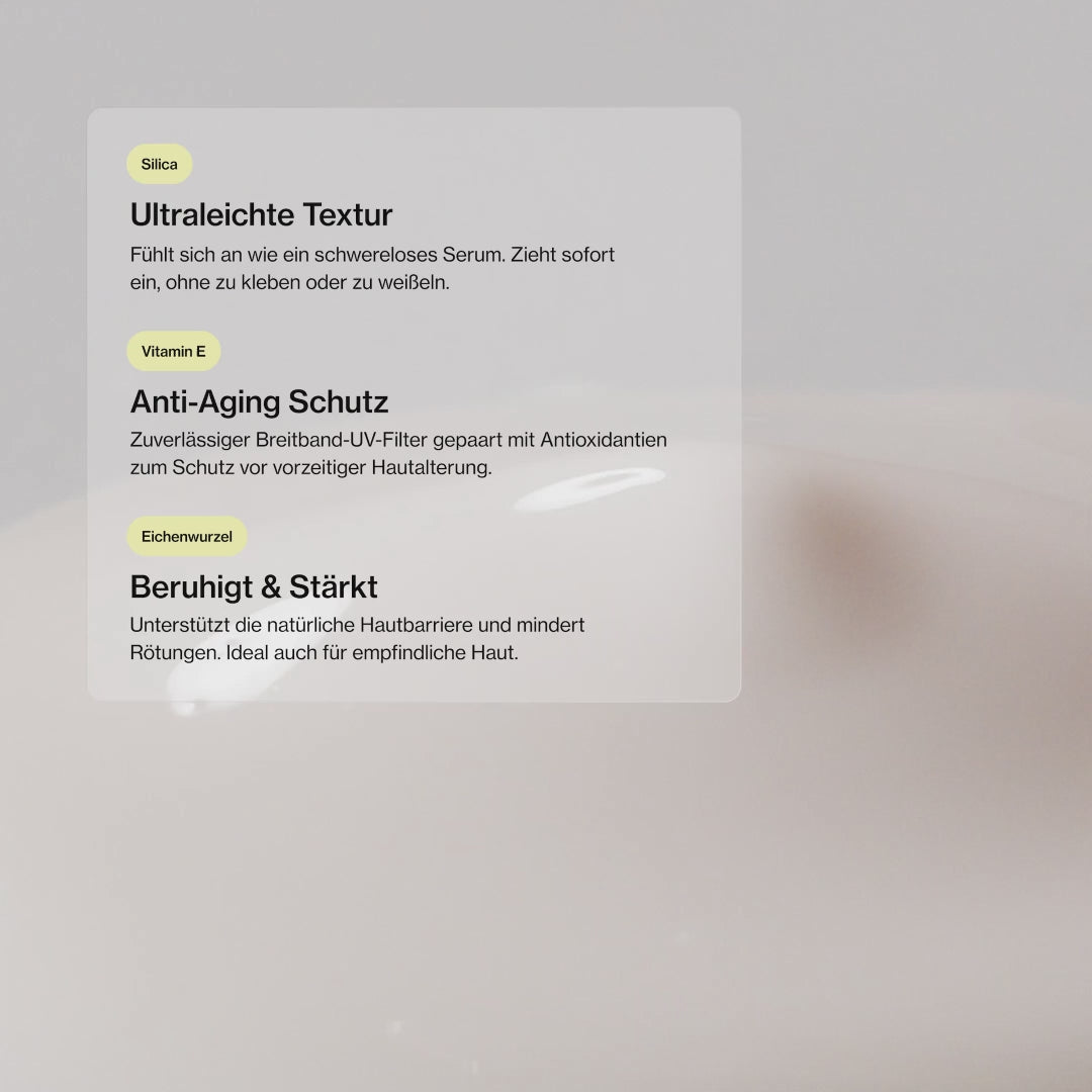 Unsere ultraleichte Sonnencreme mit LSF 50 für täglichen Schutz: Sie kombiniert hochwirksame UVA- und UVB-Filter mit antioxidativem Eichenwurzelextrakt und Vitamin E, um Deine Haut zuverlässig vor Sonnenschäden, freien Radikalen und vorzeitiger Hautalterung zu bewahren. Kiwi-Wasser und Bisabolol beruhigen und spenden Feuchtigkeit, während die federleichte Textur schnell einzieht – ohne Weißfilm, ohne Kleben. Ideal für alle Hauttypen, auch sensible Haut, und perfekt fürs tägliche Layering, ob unter oder über dem Make-up.